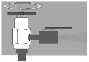 将SO-BV工具连接到注脂嘴上之前,首先逆时针旋转SO-BV工具上的T型手柄使顶杆上行至最大位置,然后拆除密封注脂接头上的金属盖帽,将SO-BV工具连接在注脂接头的螺纹上并旋紧。然后顺时针旋转SO-BV工具上的T型手柄,顶杆下行,使得注脂接头内的球形止回阀“离座”,可以使得阀体内的物质通过泄放孔和后端的阀门被释放出(如下页图7)。